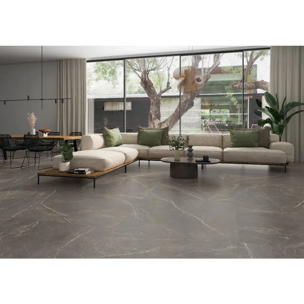 De Fior di Bosco Marengo silk 120x120 rett is een keramische tegel met zijdeglans oppervlak in een diepe, koele grijstint. De natuursteenlook komt subtiel naar voren op het grote formaat, wat bijdraagt aan een elegante, rustige sfeer.